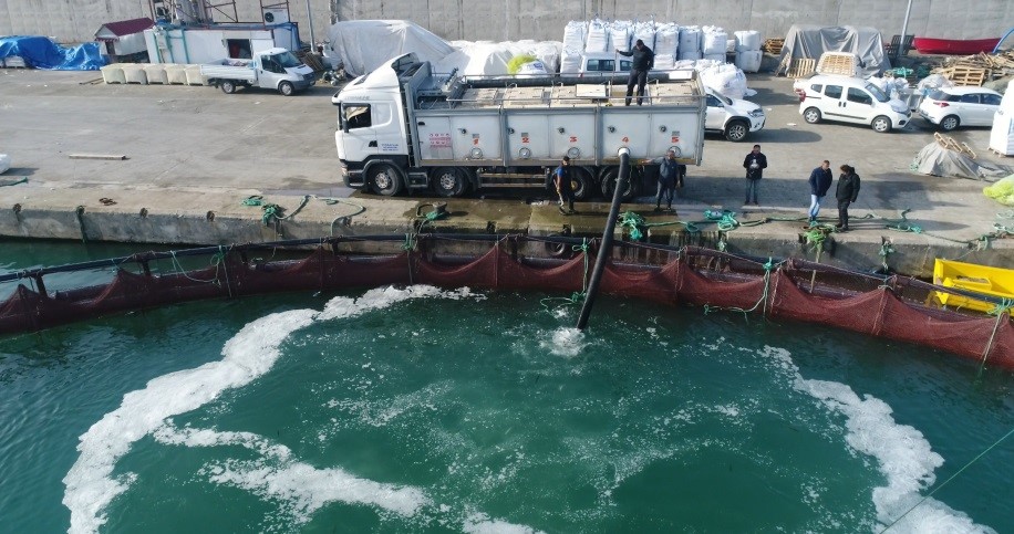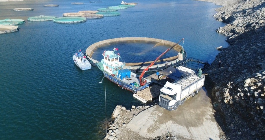 Net cages in Kurtun Dam, fish are transferred to the sea by trucks